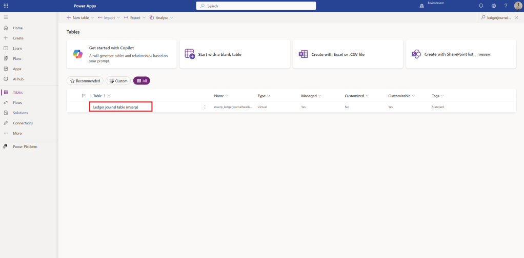 - Navigate to Tables in Power Apps and search for your Virtual Entity.
