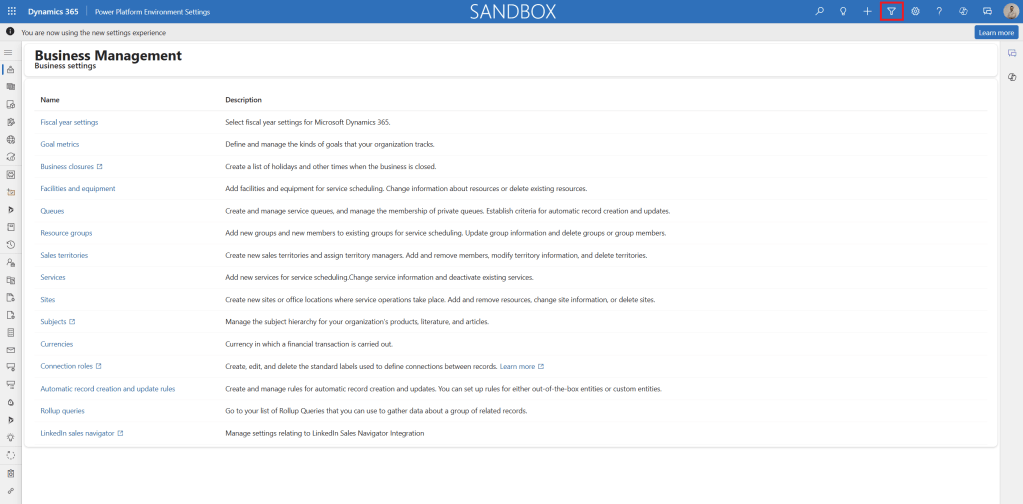 - Click on the Environment URL in the details section to open the environment, then click the Advanced Find filter icon.