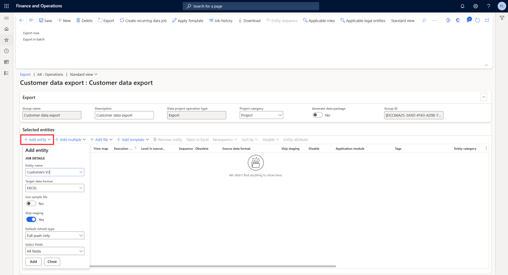 2️⃣ Add Entities to the Project: Once your data project is created, you can add an entity to it. Click Add entity and select the data entity you need (for example, Customer V3 for customer records), and pick the target data format (Excel, CSV, XML, etc.).