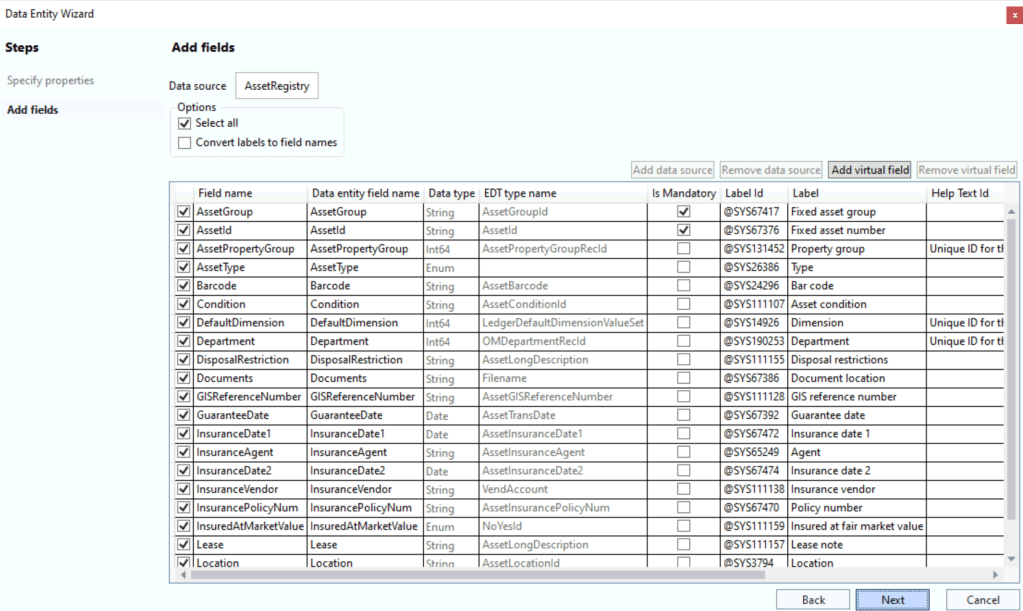 3️⃣ Select Fields (and Related Data): The wizard will prompt you to choose fields from your primary table. Typically, you’ll select all fields initially and later remove any unnecessary ones. You can also add fields from related tables if needed. For example, if your “AssetRegistry” table links to an “AssetType” table via a foreign key, you can easily pull relevant fields like “AssetTypeDescription” into your entity.