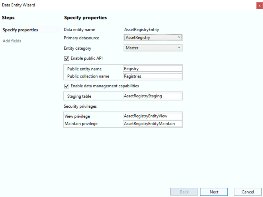 - Enable data management capabilities: Check to allow import/export operations via the Data Management Framework (DMF), automatically creating the staging table (e.g., “AssetRegistryStaging”).
